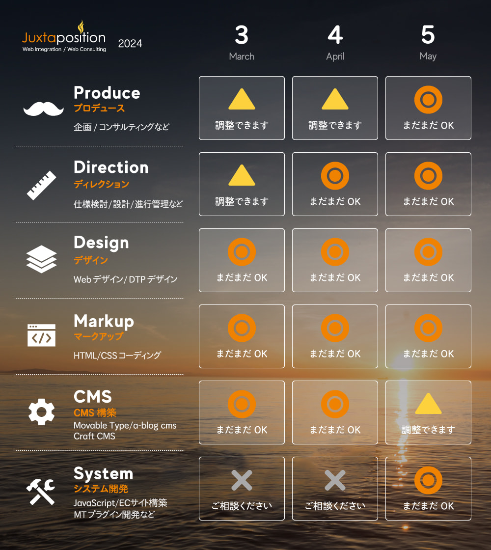 当初、3月に集中していたMovable Type関連のご依頼が、一部4月以降にスケジュール変更となったことから、先月のご案内よりリソースに空きが生まれています。