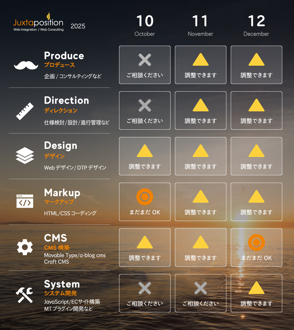 そんな10月から12月にかけての弊社リソース状況をお知らせいたします。